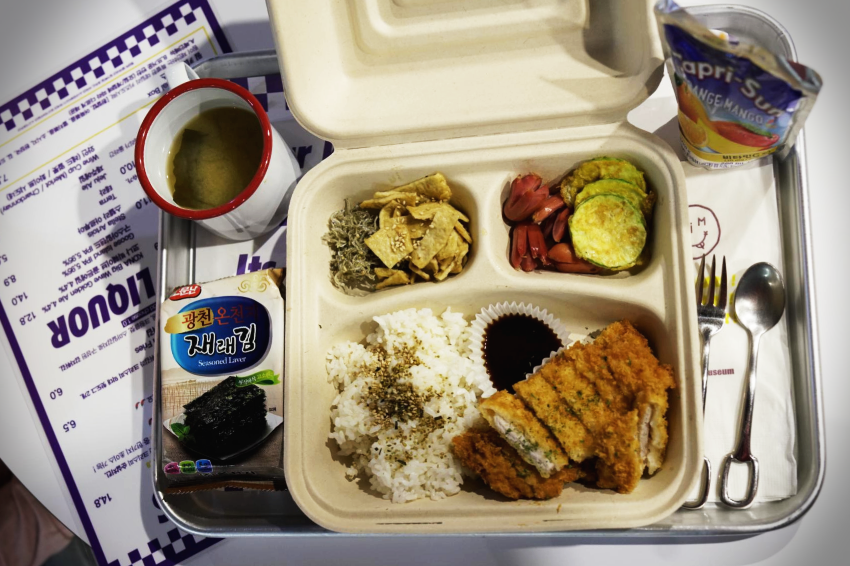 된장국, 김, 멸치, 어묵, 햄, 호박전, 밥, 돈가스, 오렌지 주스!!