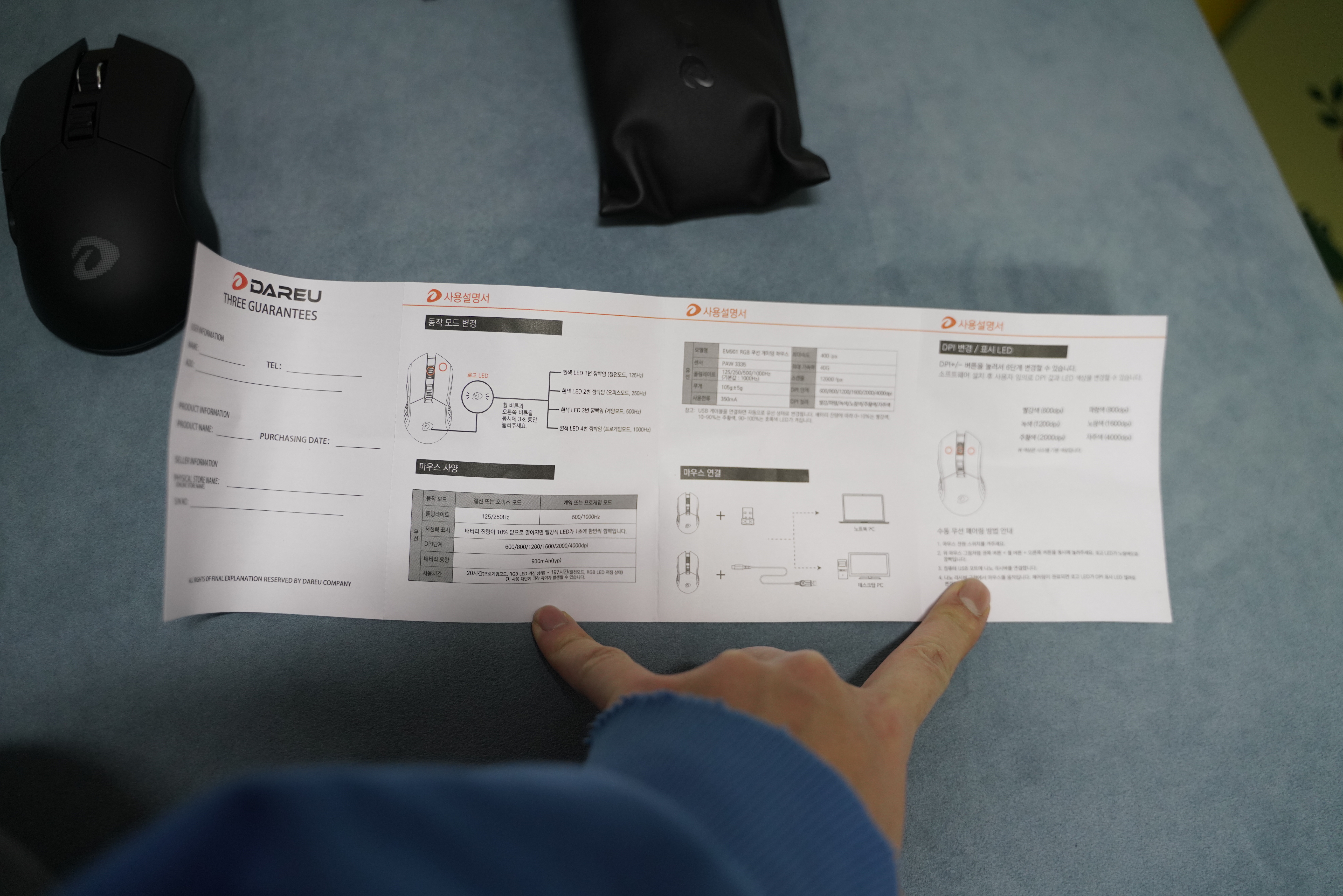 구성품은 마우스, usb 연결선, 나노 리시버, 설명서, 파우치!!! (흰색은 없다..)