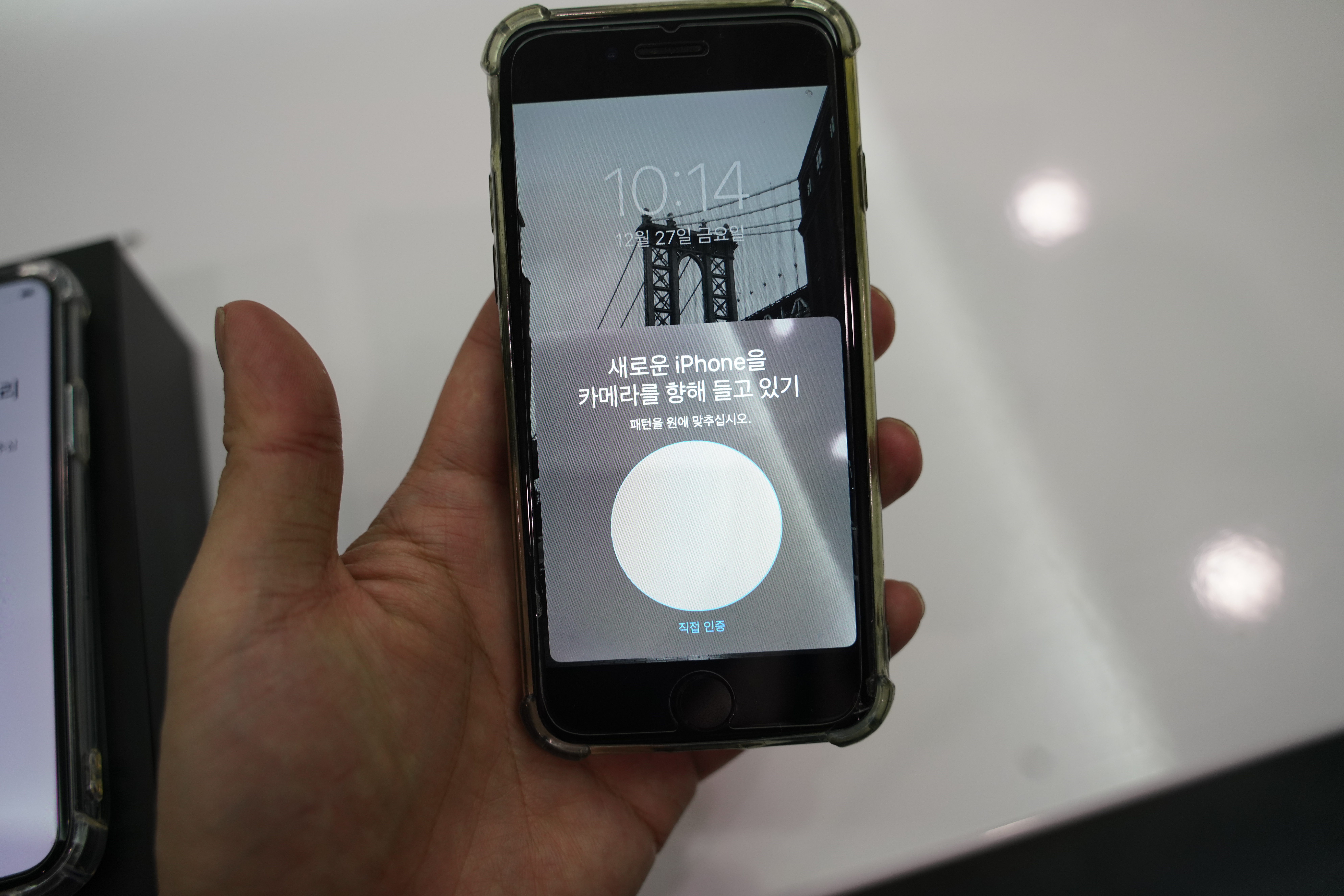 이전에 쓰던 아이폰 카메라 화면에서 동그란 부분을 새로운 아이폰의 가져갑니다.