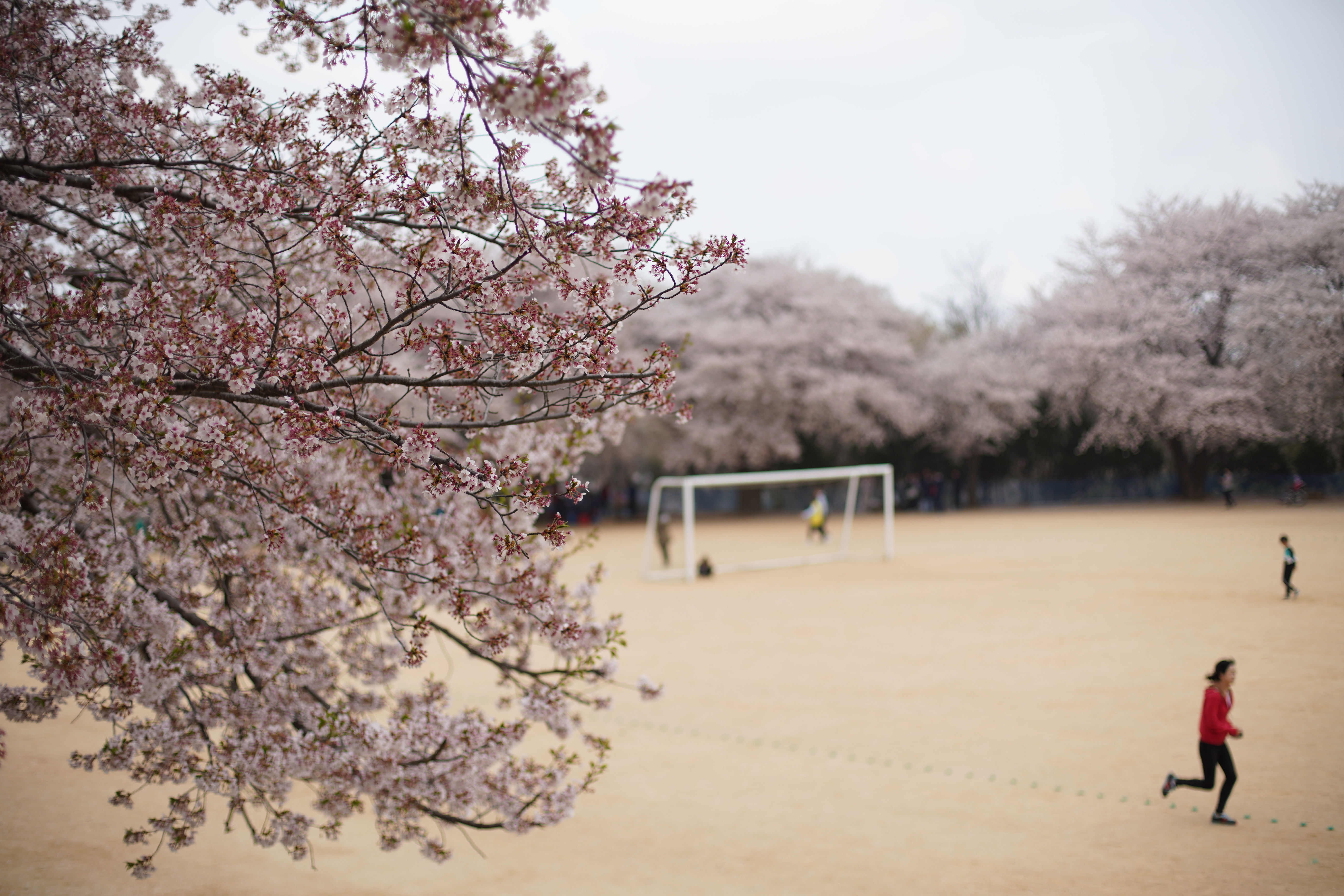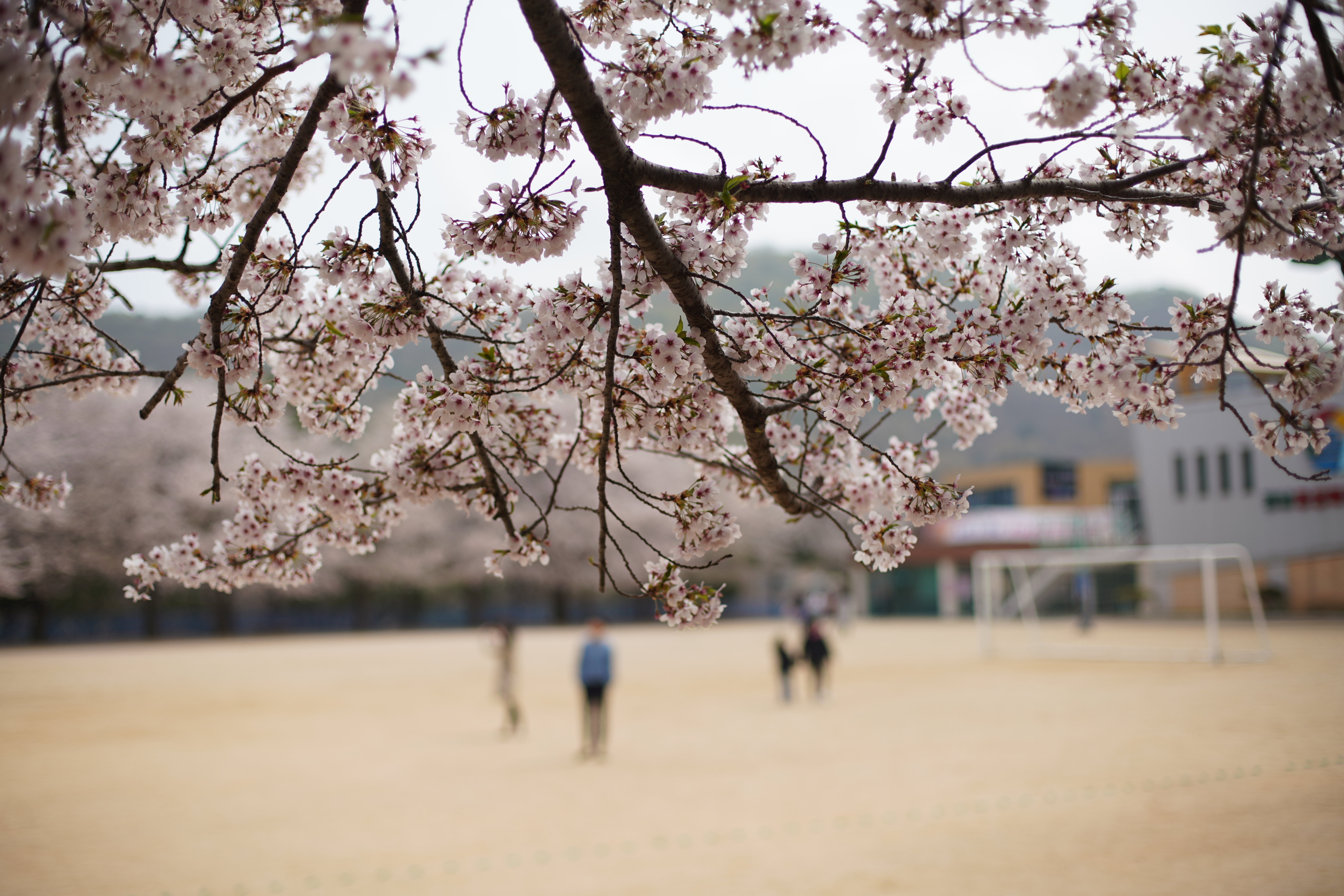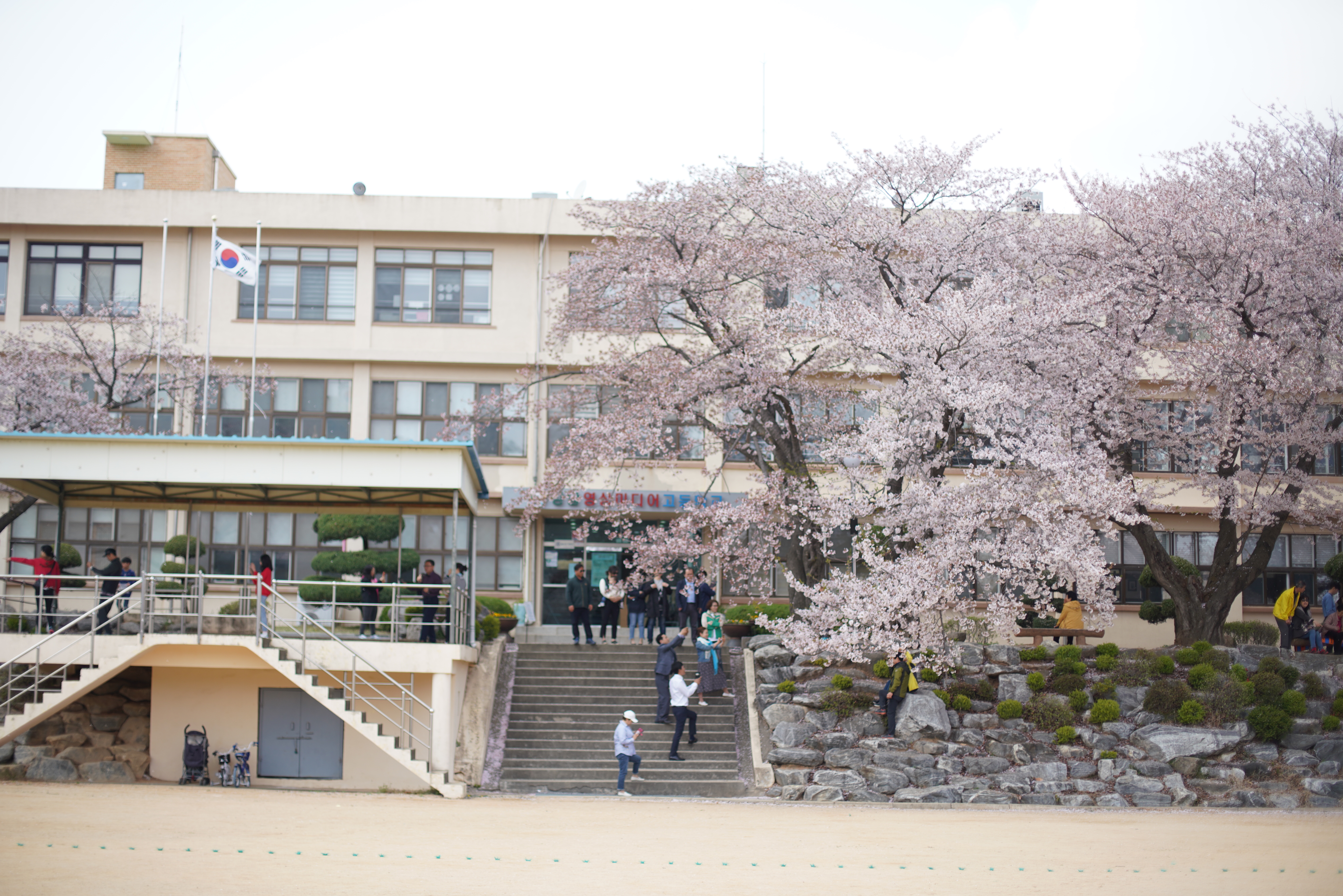 고등학교 운동장을 중심으로 사방이 벚꽃나무로 되어 있어요!
