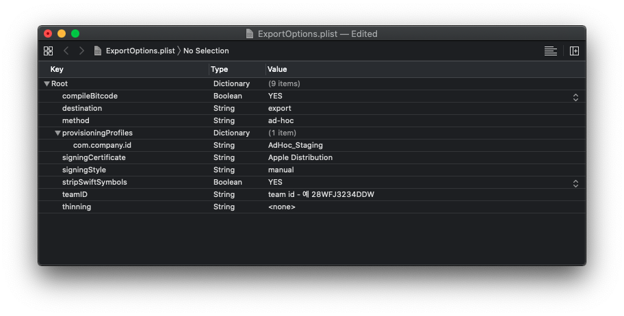 Xcode Server를 이용해서 또는 iOS앱의 ipa 패키지를 만들 때는 xcodebuild의 -expoertOptionsPlist 옵션파일을 지정해야 한다.