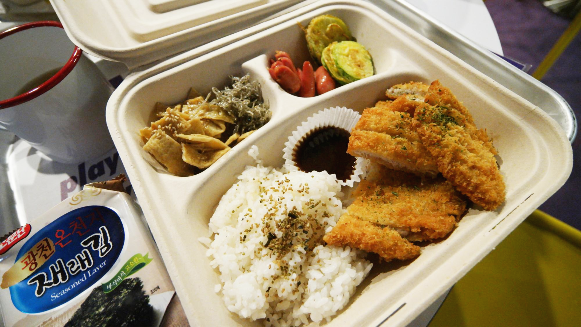 된장국, 김, 멸치, 어묵, 햄, 호박전, 밥, 돈가스, 오렌지 주스!!
