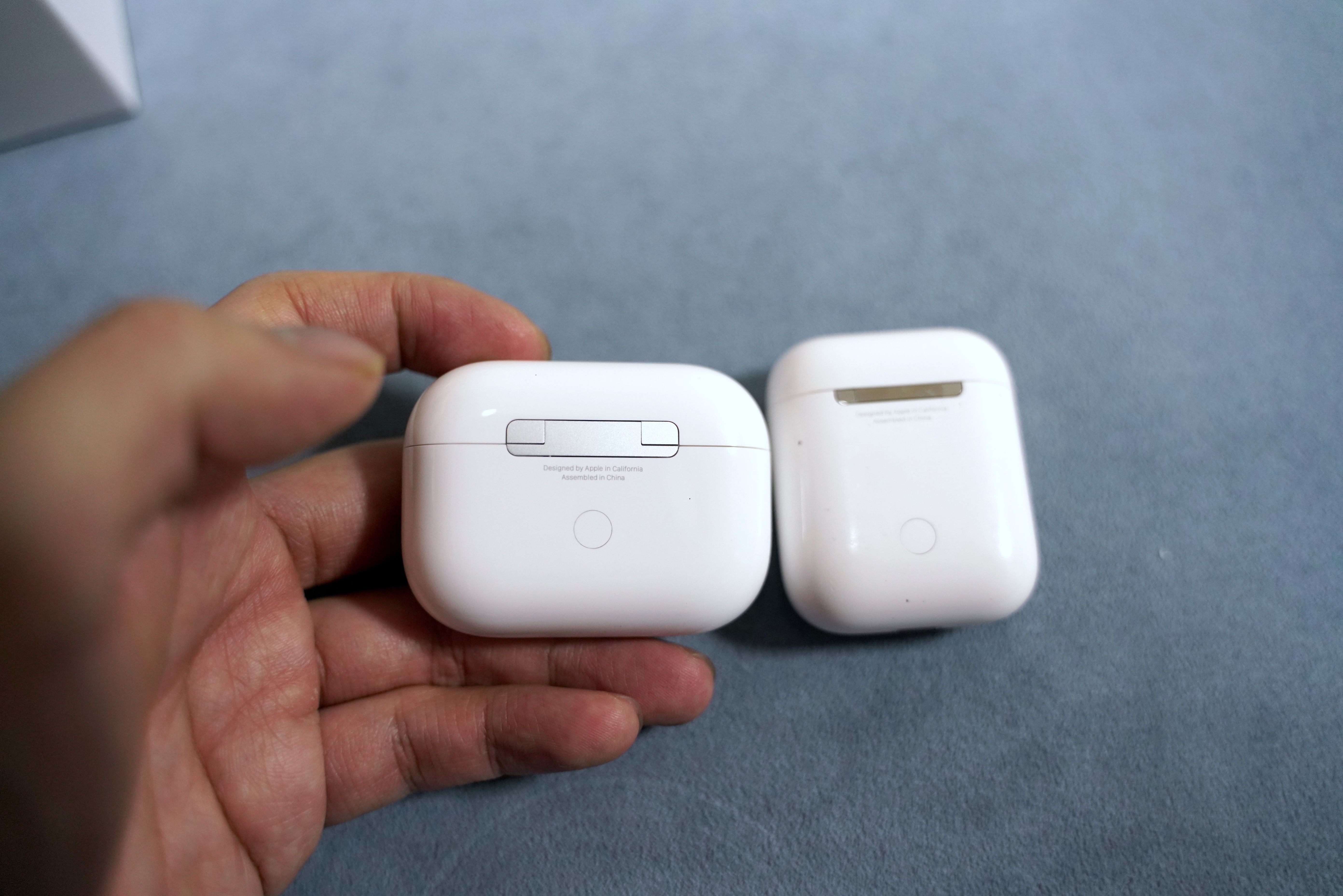 왼쪽이 에어팟 프로, 오른쪽은 에어팟 1세대 입니다. 에어팟 프로는 가로로 길고 에어팟 1세대는 세로로 기네요.
