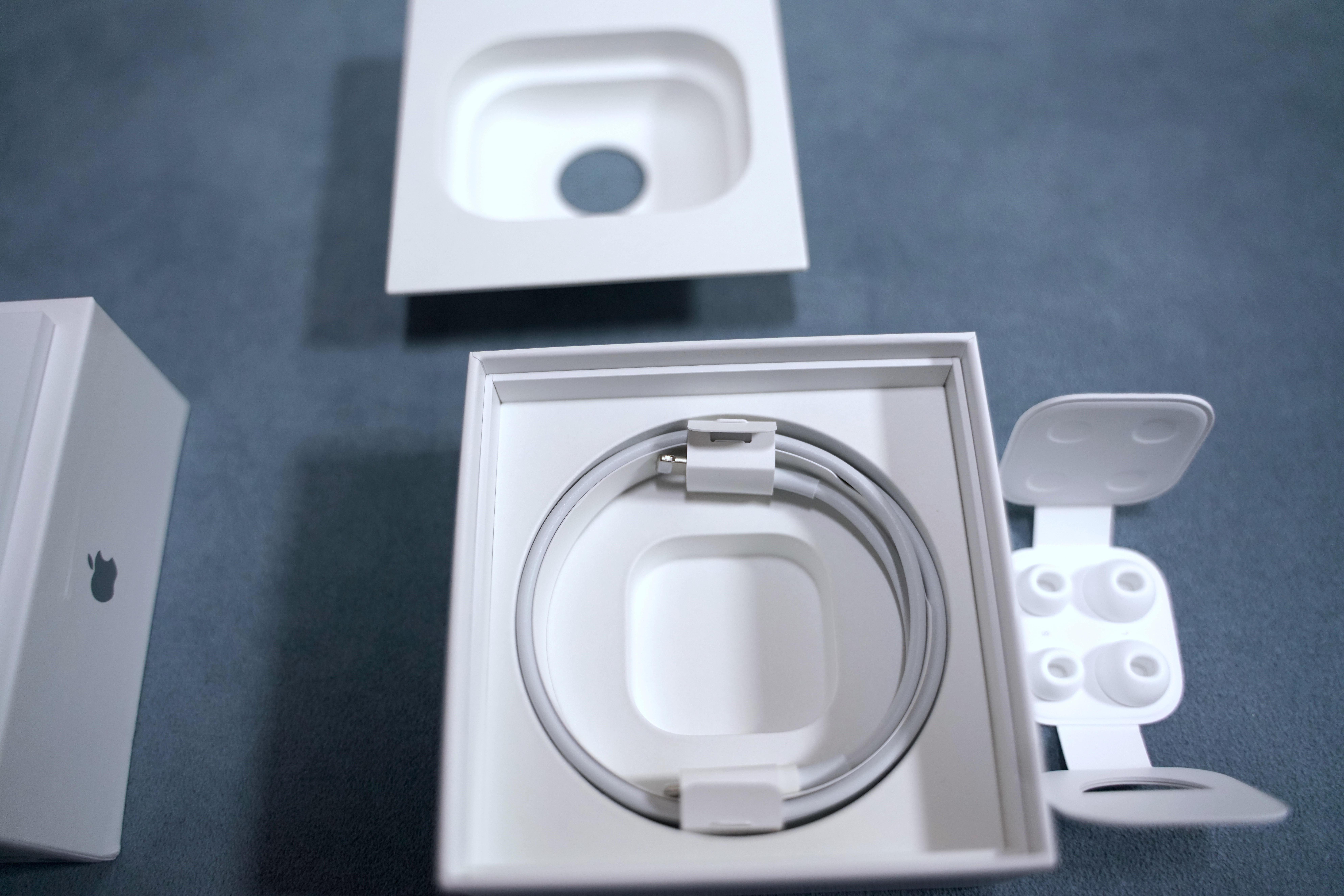 아주 단순하게 설명서, 에어팟 프로, 충전선, 그리고 2종류의 폼팁이 들어 있습니다. 끝!!