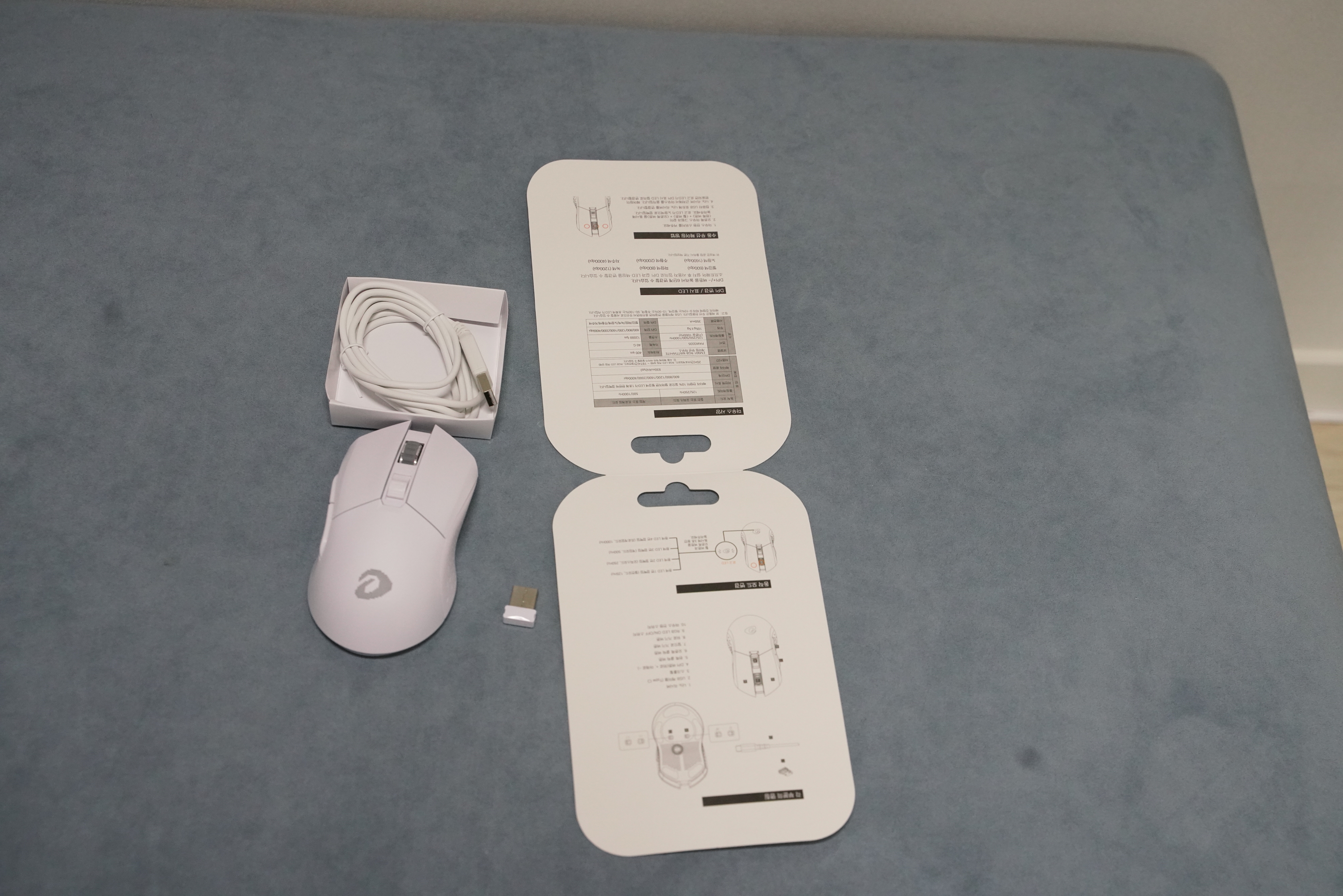 구성품은 마우스, usb 연결선, 나노 리시버, 설명서, 파우치!!! (흰색은 없다..)